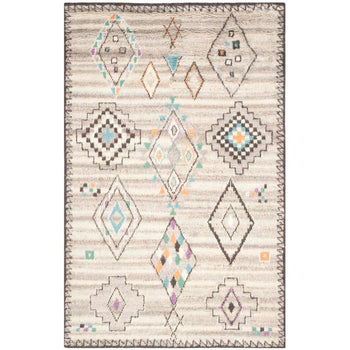 The rug's distinct pattern, as illustrated in the provided image, features an array of geometric motifs and symbols set against a soothing natural background. The versatile palette bursts with multi-colored accents, including shades of teal, orange, violet, and more, providing an eclectic mix that complements both modern and traditional interiors.