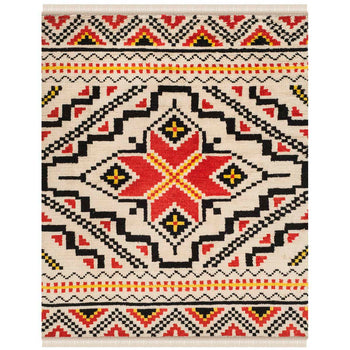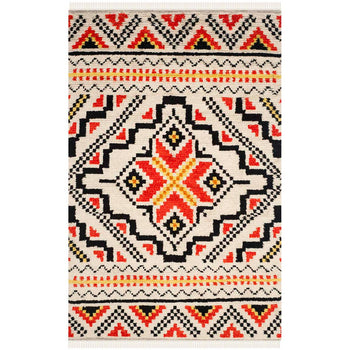 With an intriguing pattern that draws the eye, this area rug features a harmonious blend of bold and vibrant multicolor motifs, including rich reds, contrasting blacks, and touches of yellow, creating visual interest that anchors your room. The intricate geometric shapes and symmetrical design exude an artisanal charm and a sense of global adventure.