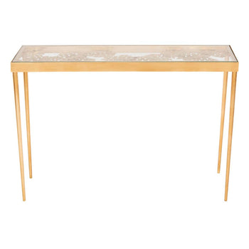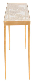 Redefine the living room with this Leilani Console. An ethereal glass design highlights its delicate palm leaf artistry, while its rich gold leaf finish adds a luxurious touch. A contemporary collector's item, it's a hallmark of gracious living.