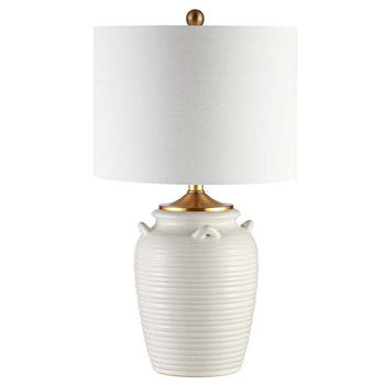 A favorite of collectors, this Lener Table Lamp exudes the artistry that emanates from a potter's wheel. Beautifully crafted of ceramic in reactive ivory, Lener's urn shape and handle accents recall sculpture's ancient roots, while gold finished hardware and a white drum shade give a contemporary touch.