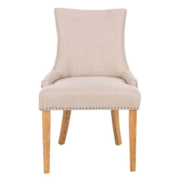 The Lester Dining Chair is full of elegant ease with its low sloped arms and subtle hourglass shape. Upholstered in a soft linen blend, Lester is accented with birch wood legs in an espresso finish and silver or brass nail head trim. Sold in sets of two.
