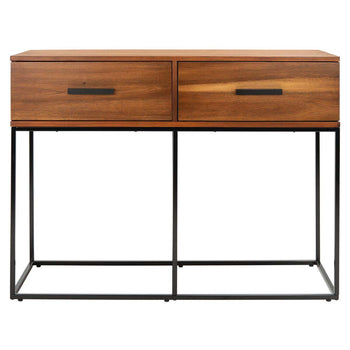 Refresh the hall or entryway with this bold Marquise Console Table. Marquise's open black metal Parson's style frame provides stunning visual depth and serves as an artistic counterpoint to the organic wood grain flowing over its two brown mahogany drawers, instantly upgrading any interior.