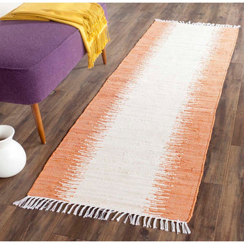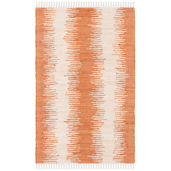 Crafted in the vibrant hues of orange, this rug features an intriguing pattern reminiscent of rhythmic brushstrokes or natural organic textures, giving it a dynamic and modern appeal while retaining a sense of timeless charm. The white fringe borders add a playful contrast, embodying a casual yet sophisticated aesthetic.