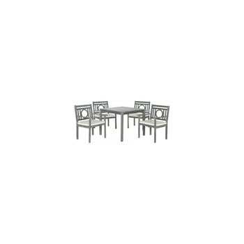 Resort chic styling defines the classic elegance of the Montclair 5 piece dining set with contemporary circle cut out motif on chair backs and slatted seats and table top. Masterfully crafted of acacia wood in natural with beige all weather cushions.