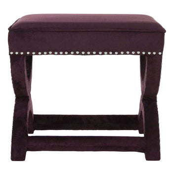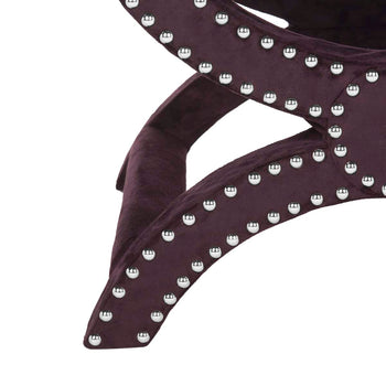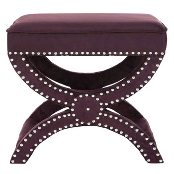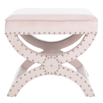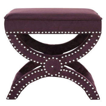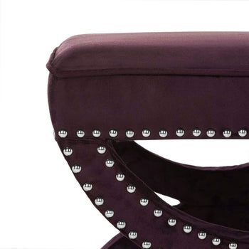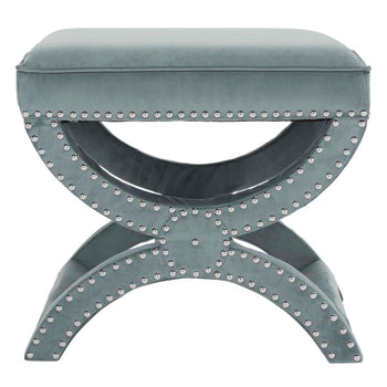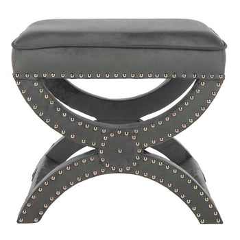 A contemporary descendant of the classic Savonarola chair, the Mystic Ottoman gracefully curves the distinctive X style frame. Upholstered in soft grey poly velvet with silver nail head detailing, use Mystic in pairs under a console, in front of the bed, or anywhere you want a touch of glamour.