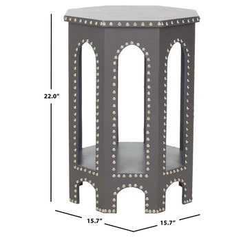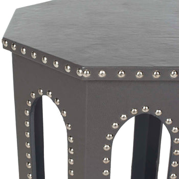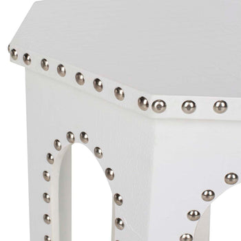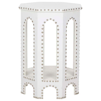 Inspired by the timeless, romantic feeling of gothic arches, the Nara End Table offers a contemporary spin on classic style. Crafted with iron nail head detail, its six sides blend geometric form with a fresh, solid palette.