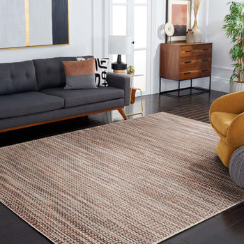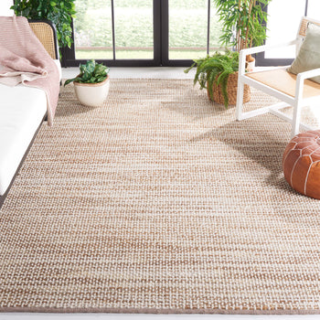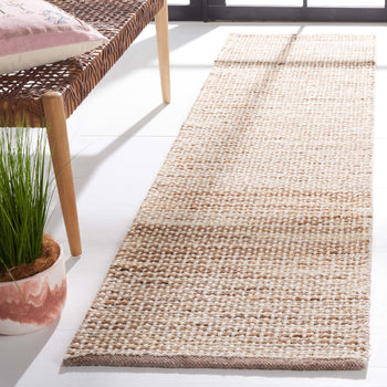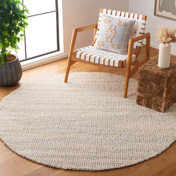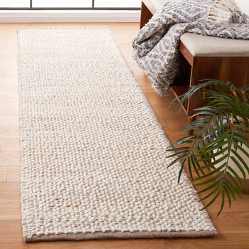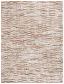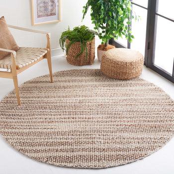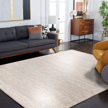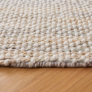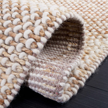 Colored in a sophisticated palette of natural and beige hues, the rug imparts a serene and organic feel, making it an easy match for any decor. The understated elegance of the color scheme is elevated by the textured pattern visible in the image, showcasing a series of rhythmic lines and dots that provide a subtle yet dynamic visual interest.
