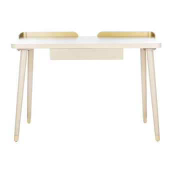 Bring the drama and character of vintage style to any home office with this modern 1 drawer desk. Meticulously crafted with an oak wood blend featuring a timeless white washed finish, its retro capped legs and gold details make it a new design classic.