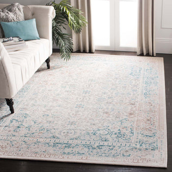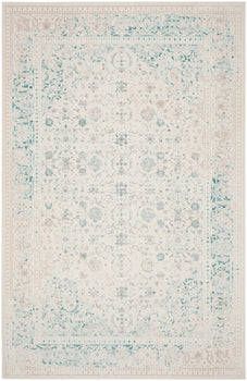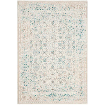 The color palette is a serene mixture of turquoise and ivory, which complements a wide range of interiors and brings a fresh and airy vibe to your space. Its design features a rich tapestry of patterns, with intricate details and motifs that speak of timeless elegance.