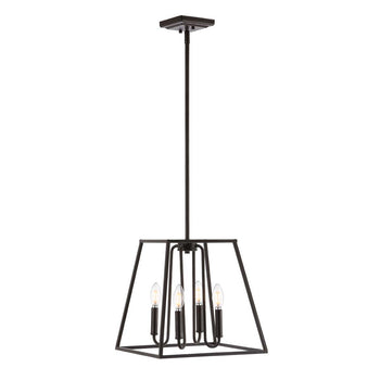 Exquisitely crafted, this modern 4 light metal pendant is a bold, inverted update of the traditional lantern. This contemporary spin features a sleek interior candelabra with minimalist, geometric lines. Designers love its classic oil rubbed bronze finish.