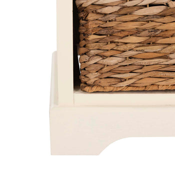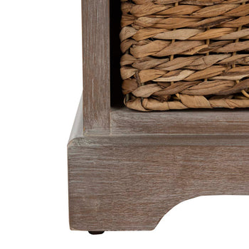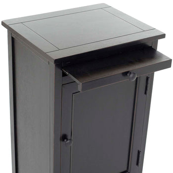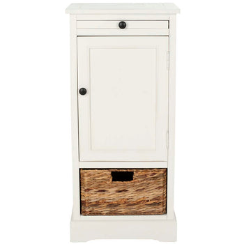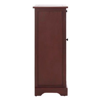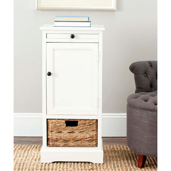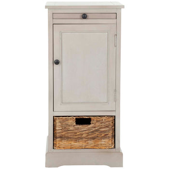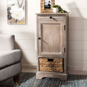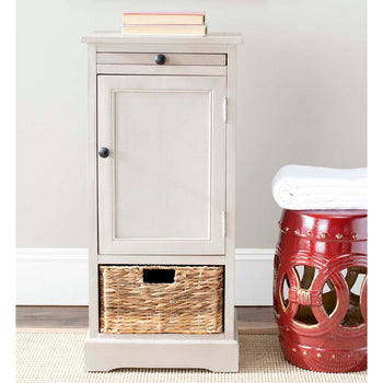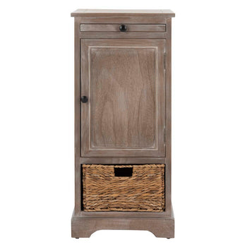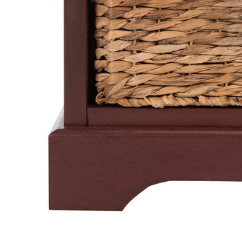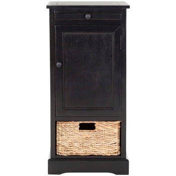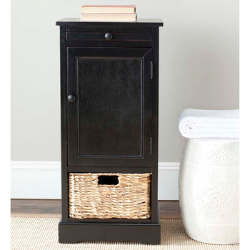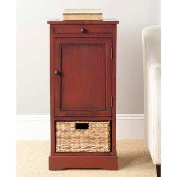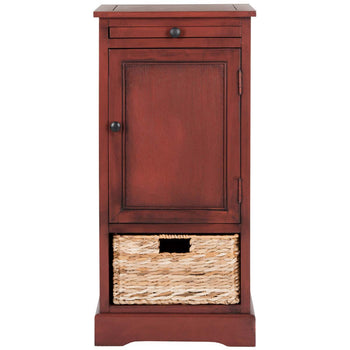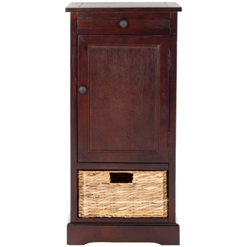 This Raven Storage Unit is a stylish storage solution in any classic contemporary or farmhouse?Decor. A two shelf cabinet in a dark cherry finish and woven basket provide ample space for stashing away life's miscellany, and a pull out writing surface makes Raven perfect for writing last minute notes in the entryway.