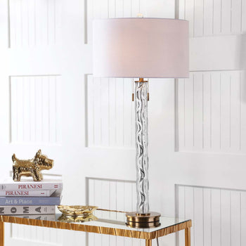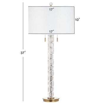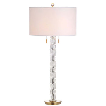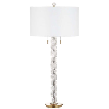 Inspired by the chic chandeliers that make NYC's newly renovated five star hotel a national treasure, this contemporary table lamp boasts timeless style. Its glass figure is paired with a luxurious metallic gold finish and classic, crisp white shade.