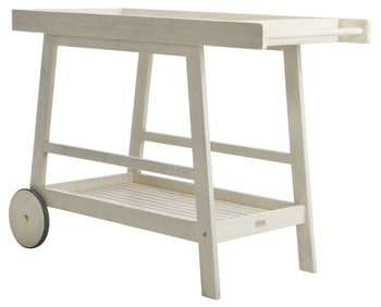 Designed for the modern host, this contemporary indoor outdoor bar cart makes entertaining a breeze. Styled in a clean white finish, its eucalyptus wood construction makes it perfect for transporting cocktails and canapes from the kitchen to any outdoor oasis.