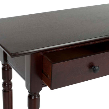 The Rosemary Console, in a dark cherry finish, evokes craftsman style with its clean lines and practical storage. Crafted from pine with two drawers and a bottom shelf, this console will enhance casual dens, front entry, or bedrooms with its refined farmhouse charm. Minor assembly required.