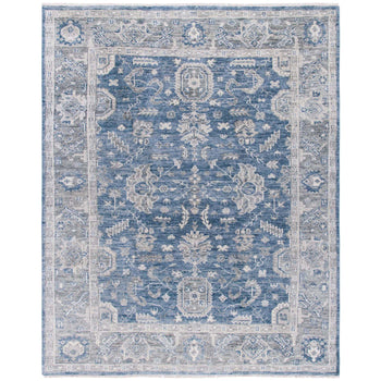 The splendid interplay of serene blues and soothing greys conjures up an aura of tranquility, while the intricate pattern details tell a story of classic sophistication. Drawing inspiration from historical motifs, the rug features a harmonious blend of floral and geometric designs, bordered by a delicate, yet pronounced edge that anchors the piece beautifully.