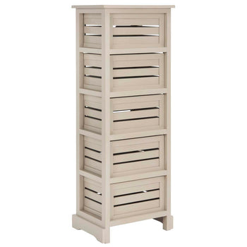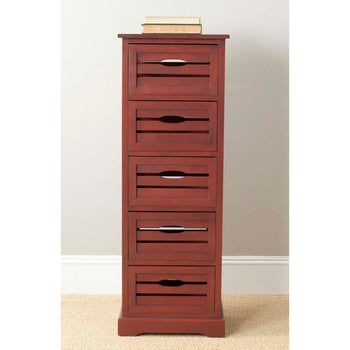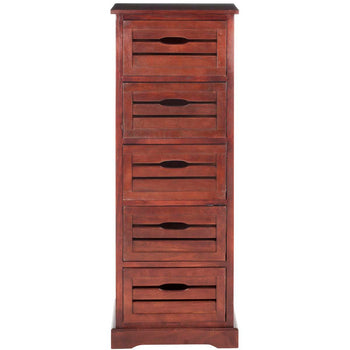 The classic lingerie chest is treated to a coastal makeover with the Sarina Cabinet. Crafted of pine in a dark cherry finish, the British Colonial frame is updated with open handles on its five slatted drawers inspired by old fashioned fruit crates.