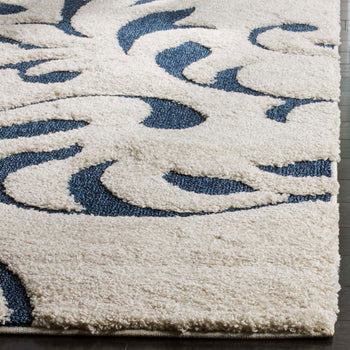 Proudly made in Turkey, the rug boasts a durable construction method renowned for producing long-lasting quality. The design pattern, visible in the image, features flowing curves and organic shapes in contrasting blue tones that dance across the cream background, adding visual interest and contemporary flair.