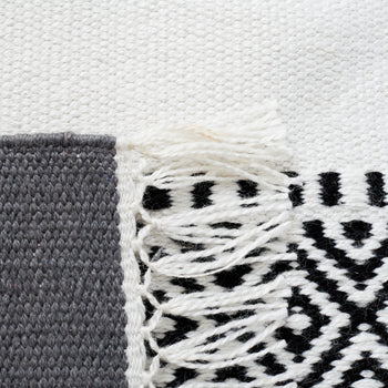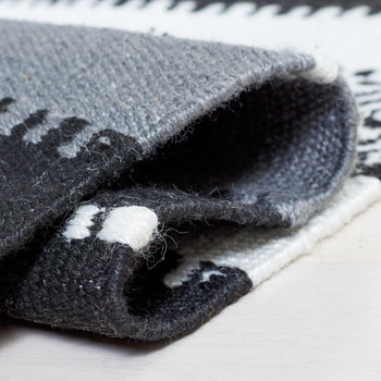 Our runner's captivating pattern is inspired by traditional motifs ? with bands of geometric shapes and stylized elements set against a contrasting black and ivory backdrop. The pattern delivers a visual interest that can serve as a statement piece or complement a monochromatic decor scheme.