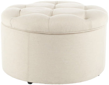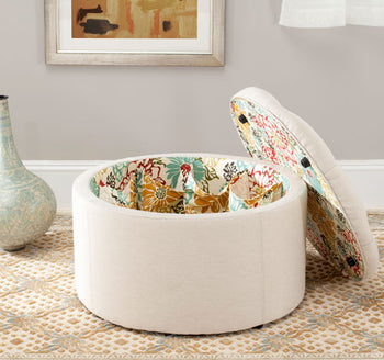 Shoe storage with style! Dress up your bedroom, living room or closet with a luxurious tufted ottoman every shoe lover will adore. Especially designed to neatly store shoes, this space saving ottoman has room for purses, belts and more. Handcrafted of wood and covered in a linen blend fabric, Tanisha is fully lined with a garden floral print in pure cotton. It's the ultimate secret weapon for home organization, and perfectly adaptable to your storage needs.