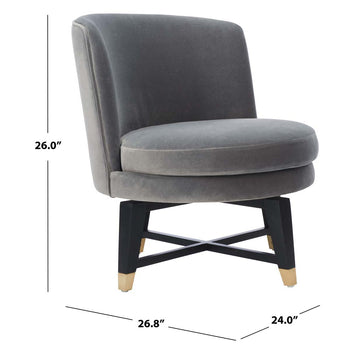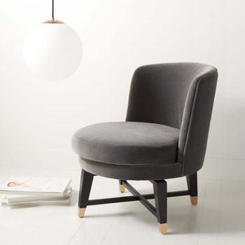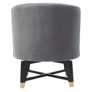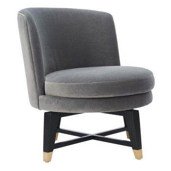 A stylish gathering of glamour and whimsy, the Trinity Swivel Accent Chair invites you to take a spin in the lap of luxury. Trinity's charcoal velvet is plush and enticing, and its antique black mahogany legs with brass cap accents give it the air of a lavish boutique. An absolute necessity in high fashion interiors.