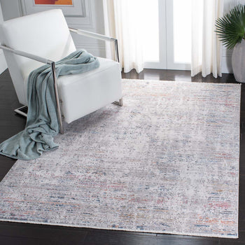 The color palette is a sophisticated mix of grey and blue, offering a neutral base with a hint of color that can complement a wide range of interiors. The contemporary style of the rug is highlighted by its abstract pattern, which features an array of streaks and lines in various shades that add depth and interest without overwhelming the space.