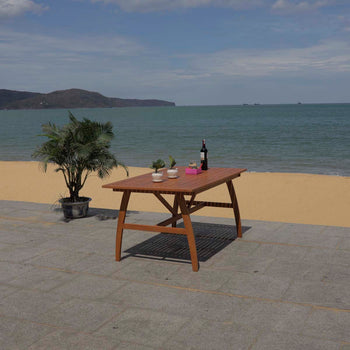Designed for the modern host, this deluxe contemporary outdoor dining set is a great value. Constructed with natural eucalyptus wood, its four chic chairs include complimentary cushions, and its matching generous table is perfect for dining in style.