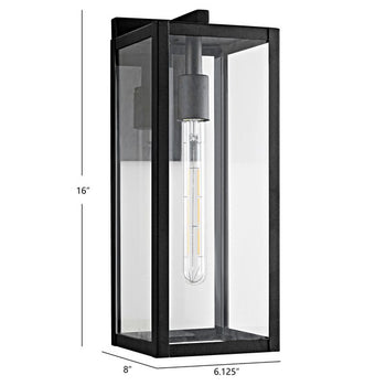 Designed with form and function, this contemporary outdoor wall lantern instantly transforms any outdoor space into a deluxe oasis. Durable and stylish, its rectangular black metal frame and clear glass create the perfect canvas for its ambient glow.