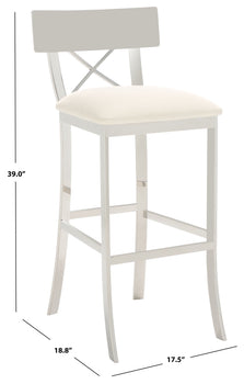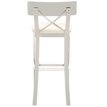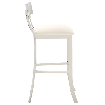 This modern bar stool is at the height of fashion. Inspired by London's legendary art deco bar, its polished stainless steel finish is as smooth as Bond's martini. With cross back detail and smooth white leather style upholstery it's always in good taste.