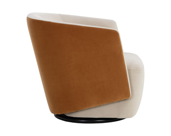 Velvety soft fabric and inviting curves give the Sarina Swivel Lounge Chair a relaxing experience. This stylish two-tone design is expertly upholstered with meg taupe fabric on the seat interior and meg gold fabric on the back exterior.