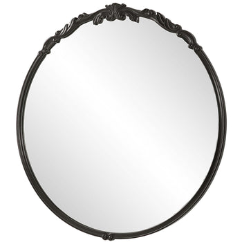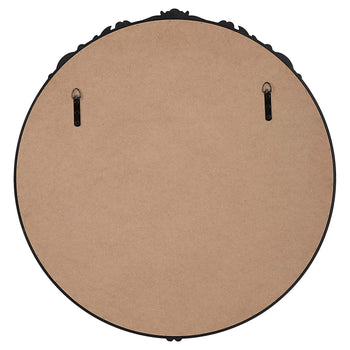 Accented with ornate details, this beautiful 30 round mirror is finished in a rich satin black. A light gray glaze accentuates the details. Perfect in an entryway, over a vanity or over your favorite table.