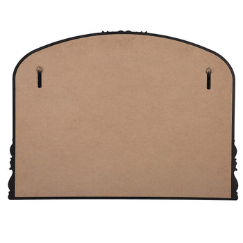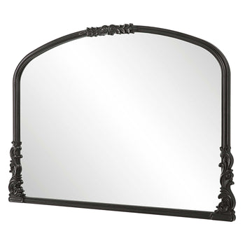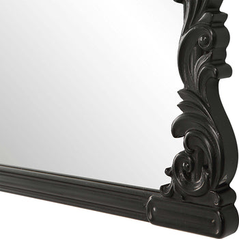 Perfect over a mantel, this Baroque style mirror features scroll embellishments at key focal points. This beautiful frame is finished in a satin black with light gray glaze that complements the ornate details. It is sure to be the center of attention at f