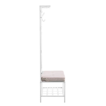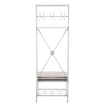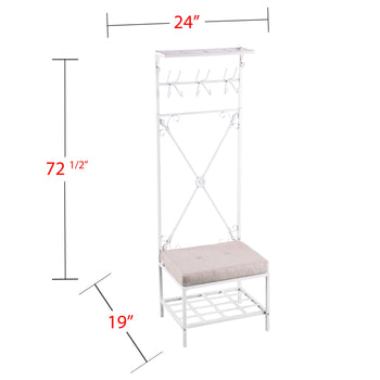 Save space and pull up a comfy bench seat with this storage hall tree. Hooks tidy dog walking gear, rain slickers, or winter accessories while ventilated shelves tackle shoes, boots, and hats. Plush padded seat offers a cozy place to get ready for the day or wind down after a hard day's work. Rustic distressed white brings the farmhouse look to a traditional silhouette. Fit fashion and function into small space living with this hall tree bench in an entry, hall, or mudroom.
