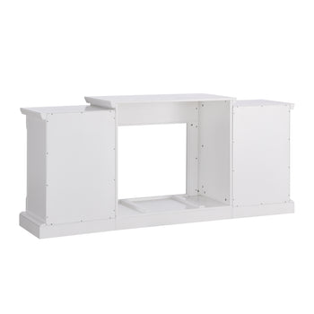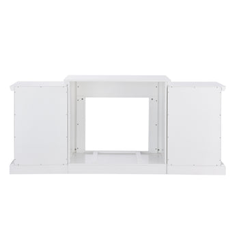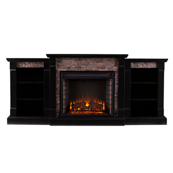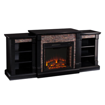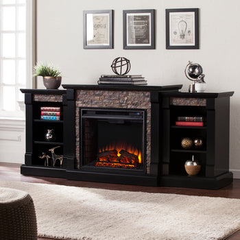 Set your heart aflame with this lodge inspired electric fireplace. Bookcase storage shelves media, novels, or tchotchkes. Satin melds with simulated river stone for a rustic touch on this traditional fireplace silhouette. Low profile and wide scale, this electric fireplace with bookcases turns on chic style beneath your wall mounted TV in the living room or as a sleek buffet in the dining room. Energy efficient LED bulbs light the fire, a cost effective way to ignite bliss in any room without professional installation. User friendly remote control offers 4-way adjustability to customize the fireplace from the comfort of your sofa. Flames and logs each have 5-level adjustment, or off. An automatic shutoff and glass that remains cool to the touch ensure the fireplace warms safely. Turn off the heat to enjoy the fireplace ambience year round.