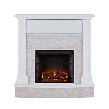Warm up the heart of your home with this contemporary, faux stone media fireplace. Easily accessible hidden media storage provides a place for DVDs, books, or remote controls, while elegant faux stacked stone traverses the hearth and surround, adding height and sophistication. Flickering LED flames and realistic embers add ambiance to your space, with or without heat. Designed as an entertainment console, this faux fireplace is beautifully convenient beneath a wall mounted TV.