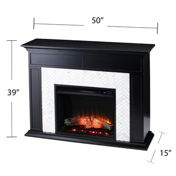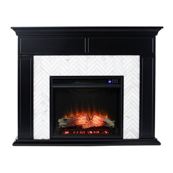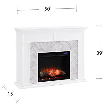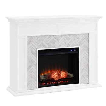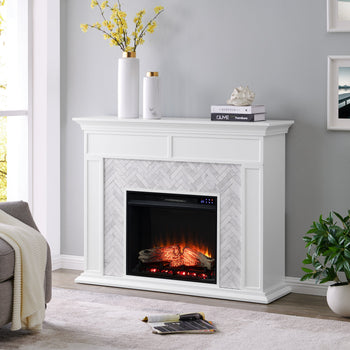 Modernize your media room with this marble fireplace. Herringbone patterned tile and real marble join together to craft a look that's both homey and elegant. Glowing faux fire logs add ambiance with flickering LED flames and lifelike embers, with or without heat. Add grace and charm to your family living area when you add this real marble fireplace to the heart of your home.