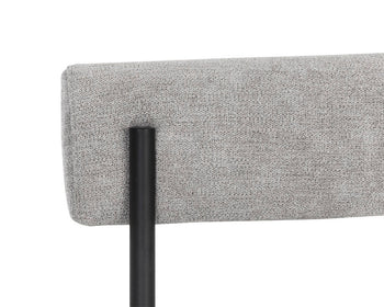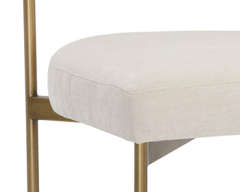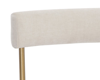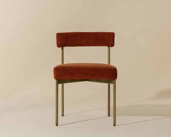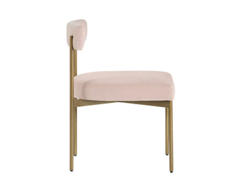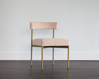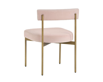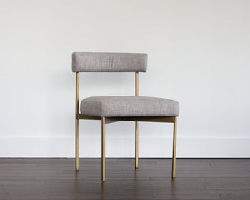 Exude modern style with this open back dining chair. Stocked in velvet slate fabric with an antique brass steel frame.