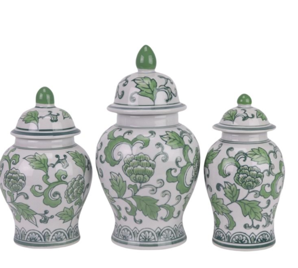 These gorgeous ginger jar canister sets are exactly what your kitchen needs! Offered in four stunning styles, they’re as beautiful as they are practical. Crafted to be food-safe, they’re perfect for keeping your kitchen organized in style. Whether used for dry goods or as a charming accent piece, these canisters make a fantastic gift idea. Green and white floral design with three size options, offering both elegance and function.