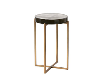 The handcrafted qualities of the Sheena End Table make it incredibly distinct. The rounded table top is made from hand-poured glass, showcasing an array of captivating imperfections that arise during the cooling process. An antique brass base finishes the look.