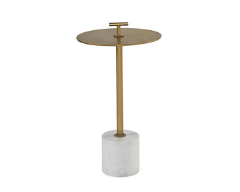 This sculptural side table is a beauty from all angles. Features a powder-coated burnished brass top and handle with a white Volakas marble base. A perfect addition for small spaces. As marble is a natural material, unique veining, pitting, fissures, micro-cracks and colour variations are all characteristics that add to the uniqueness and beauty of each piece.