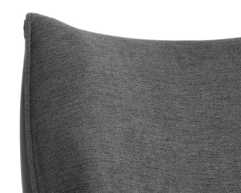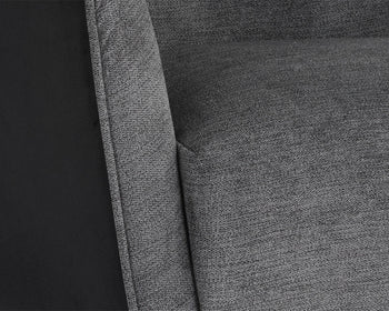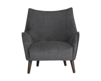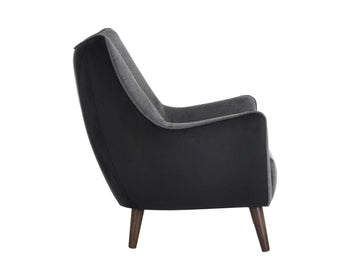 A charming mid-century inspired lounge chair with a sculpted seatback and tapered wood legs. Features a petite frame with a low seat. Stocked in polo club kohl grey fabric with a contrasting antonio black fabric seat. Performance fabric is moisture repellent, durable and easy to clean.