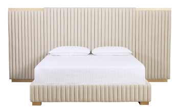 The Tarrant Bed is designed to make a statement. Featuring a large extended headboard in monument oatmeal fabric on brushed gold steel hardware. Vertical channel tufting on the front of the base and headboard adds visual intrigue to complete the piece. No box spring is required and slats are included.