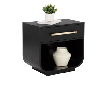Fluid lines and gentle curves make up the modern silhouette of the Tarrant Nightstand. The raffia wrapped drawer handle adds an understated touch to the black oak veneer base. Handle With Care: This design has been crafted with raffia. Each item will exhibit unique traits such as texture and thickness variations that add to the natural character of this finely woven material. Visit our Product Care page for more information on how to ensure the lasting beauty of this piece.