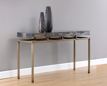 A traditional design comes to life with elements inspired by global travels. This console table is crafted with an iron top featuring a supernatural patina finish with an antique brass base. Made in India. With refined craftsmanship, this design was brought to life by skilled local artisans. By nature, these materials develop unique imperfections such as markings and colour variations for a truly one-of-a-kind piece.