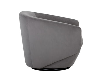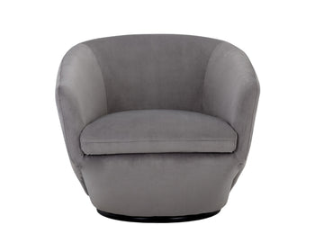 A modern swivel lounge chair designed with an angular base and a comfortable seat.