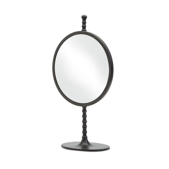 Adorn a mantel, dresser or console table with this vintage convex table mirror and black stand. Comprised of an aluminum frame and convex mirror. These distorting mirrors while decorative today, were used for entertainment and spying on others in earlier times.