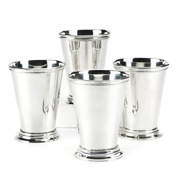 Inspired by classic mint julep cocktail glasses, these four silver-plated brass vases prefer to hold your favorite flowers. Each shimmering design features intricate details including three-dimensional dots along the top and bottom.