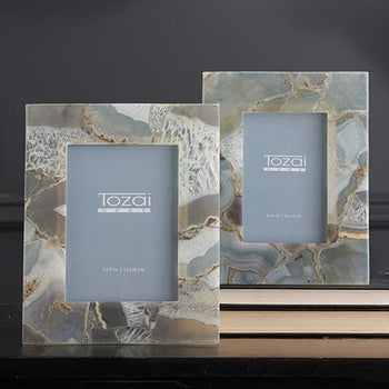 Crafted from agate, this set of photo frames will add a unique, artisan touch to your photos. As with natural agates, each piece will have variances in color and pattern: no two will be exactly alike. The set includes a 4 x 6 and 5 x 7 frame.