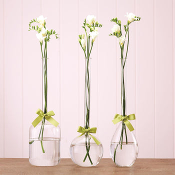 Like little gifts sprouting a flower or greenery, this set of three designs is made from hand-blown glass. Unlike traditional vases, the stunning designs feature a unique green ribbon detail that can be updated to fit any look or decor.