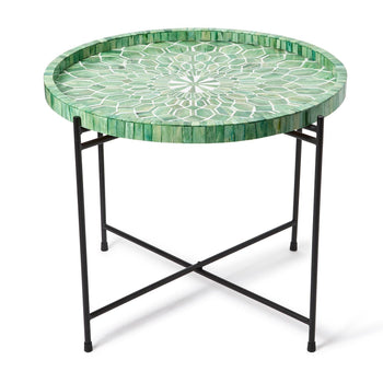 Elevate your hosting game with our Emerald Cut Hand Inlaid Decorative Round Serving Tray. Each tray is hand crafted from small pieces of bone dyed in a rich emerald greeen. Perfect for serving drinks or displaying your favorite décor pieces, this piece adds a touch of elegance to any setting. Hand inlaid by skilled artisans, each tray is unique, showcasing intricate craftsmanship. Whether serving guests in your living room or as a statement piece in your kitchen, this tray is a must-have for those who appreciate beauty in every detail. (Tray stand not included)