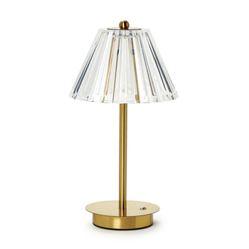 With an elegant clear acrylic shade and gold base, this LED lamp provides cordless light at the touch of a button. Once charged via the included USB cable, the lamp can be used anywhere and includes three light settings and a dimmer function.